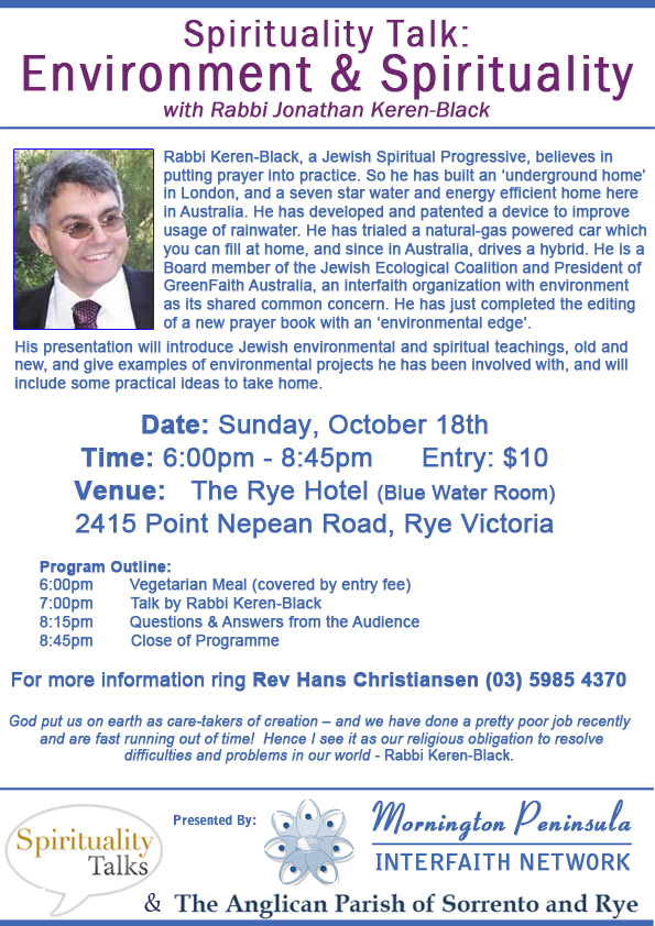 Rabbi Keren-Black, a Jewish Spiritual Progressive, believes in putting prayer into practice. So he has built an ‘underground home’ in London, and a seven star water and energy efficient home here in Australia. He has developed and patented a device to improve usage of rainwater. He has trialed a natural-gas powered car which you can fill at home, and since in Australia, drives a hybrid. He is a Board member of the Jewish Ecological Coalition and President of GreenFaith Australia, an interfaith organization with environment as its shared common concern. He has just completed the editing of a new prayer book with an ‘environmental edge’.